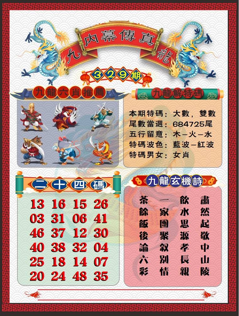 | 329期:必中五肖: 兔龙牛羊虎 |